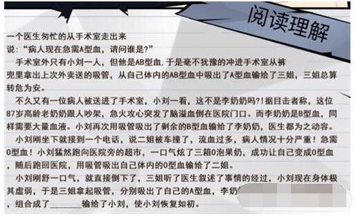 很快又有一个病人被送进了手术室。小刘看了看。这不是李奶奶吗?!据目击者称,87岁的老奶奶和别人吵架,突然脑溢血,摔倒在医院门口。8型血的李奶奶也需要大量的血液。小刘又用吸管吸出剩余的B型血,给了李奶奶,医生们被感动了。