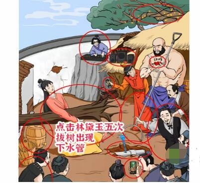 2。画面中,黛玉正在倒挂垂柳。点击黛玉拉树五次,出现一条下水管道。旁边的桶是啤酒桶。