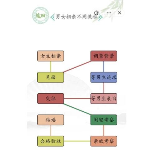 汉字找茬王是一款有趣的益智游戏,适合闲暇时玩。在Tik Tok搜索【汉字找茬王】即可体验游戏!目前已经更新了上百个关卡,其中最新的一个关卡是男女相亲不同流程怎么过?这是网上很流行的相亲流程图。不知道Tik Tok的小游戏《汉字找茬王》男女相亲不同流程通关攻略。让我们看一看。