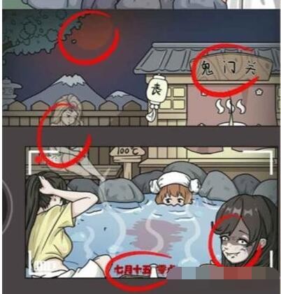 1。找出一代沙雕温泉之灵夜所有奇怪的地方:丧、100度、海豹、狐狸耳朵、七月十五、怪笑、鬼、鬼关门、红日、长发、酒壶、手、僵尸。