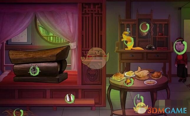4。在洞房里点击打开桌上的红盒子,点击照片中新娘的尾巴,最后点击棺材展示新娘