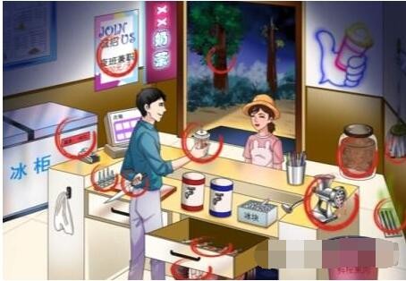 1。文字玩转美味奶茶。找出绑架店员、绞肉机、沾血拖把、消毒液、泡泡茶、人面树、招牌广告、低温保存、可疑药物、暗藏刀具、可疑注射器、腐烂恶臭等十二件令人极度担忧的事情。