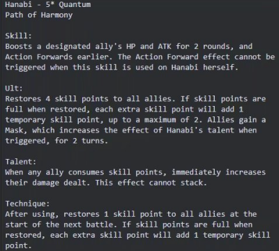 为队友恢复生命值并增加攻击力,持续2回合,并提前行动,该效果对花火无效。
