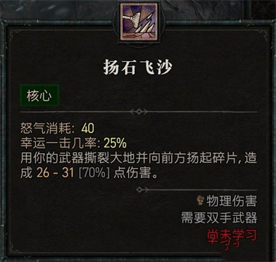 2.第二个技能更核心。建议学习扬石飞沙。它可以提供高伤害。它是我们在游戏中的主要输出手段之一。不仅可以造成AOE伤害,还可以开始狂暴。建议先强化一下。此技能天赋。