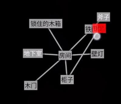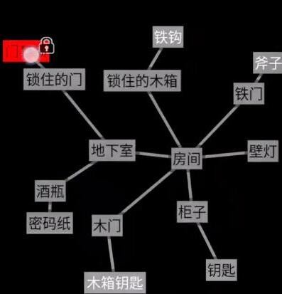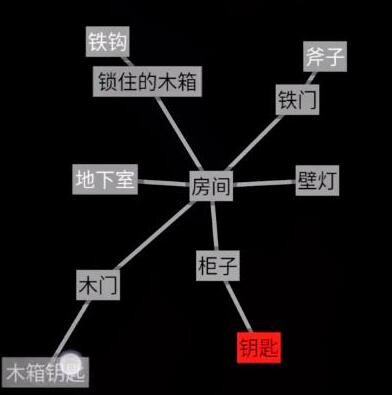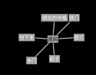 1。逃出密室打开房间可以得到【上锁的木盒】、【铁门】、【壁灯】、【柜子】、【木门】、【地下室】。
