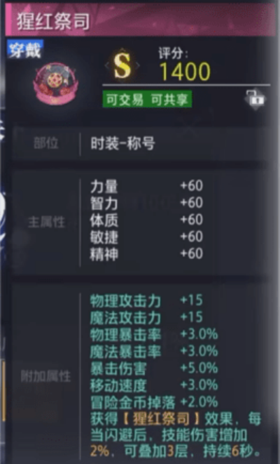 2.玩家可以交易和分享该称号。属性值高达1400的S级物品适合输出职业。