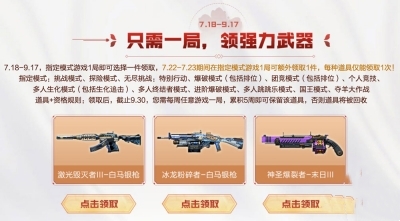 1.在规定时间内玩完指定模式,可以选择激光毁灭者III-白马银枪、冰龙碾压者-白马银枪、神圣冲击波III中的一种。 7月22日至7月23日期间,您可以额外获得一件武器。
