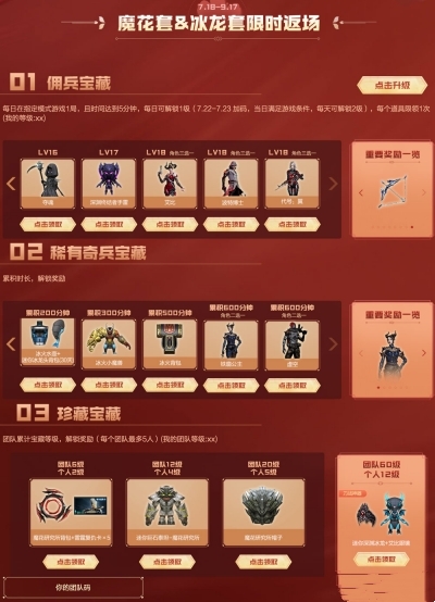 2.玩指定模式达到指定时间,组队达到指定等级,领取魔花套装和冰龙套装。