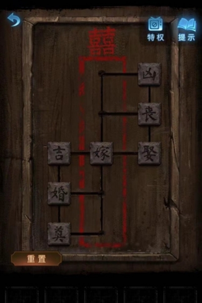 6.将文字排列成“死亡、丧葬、婚礼、吉祥姻缘”,然后点击座位上的木箱打开,获得化妆笔。