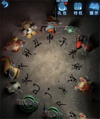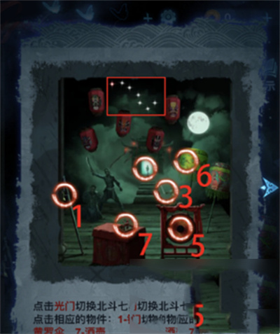 6、拆下唱片装上钟,调整北斗七星,点1-钟、3-影、5-锣、6-黄螺伞、7-烧瓶。然后切换场景,用蜡笔完成一笔。