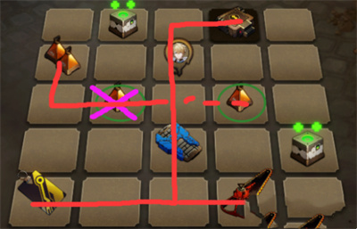 2.建议探地:紫色叉子里的两只怪物建议消灭,对角怪物距离较远,附近怪物留精英怪物增强效果。红色虚线不需要打怪,黑线不需要拿炸弹。