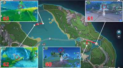 1、拉塔海古有4个水瞳,采集地点如下图所示,使用传送锚可以快速到达;