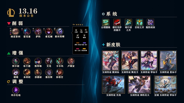 英雄联盟最新维护8月17日更新13.16版本。本次更新调整了部分英雄的属性和部分装备的性能。同时新玉剑传奇系列的皮肤出现。下面详细了解一下13.16版本的内容。