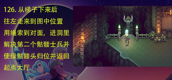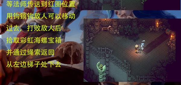 2。然后向左走,走到如图位置,用绳子勾到对面,进洞杀怪,返回大厅。