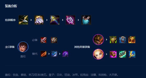 给盖伦优先收集饮血和泰坦,剩下的一个可以用于任何输出或者救命装备。力士拿辅助C装备,肉给太子。