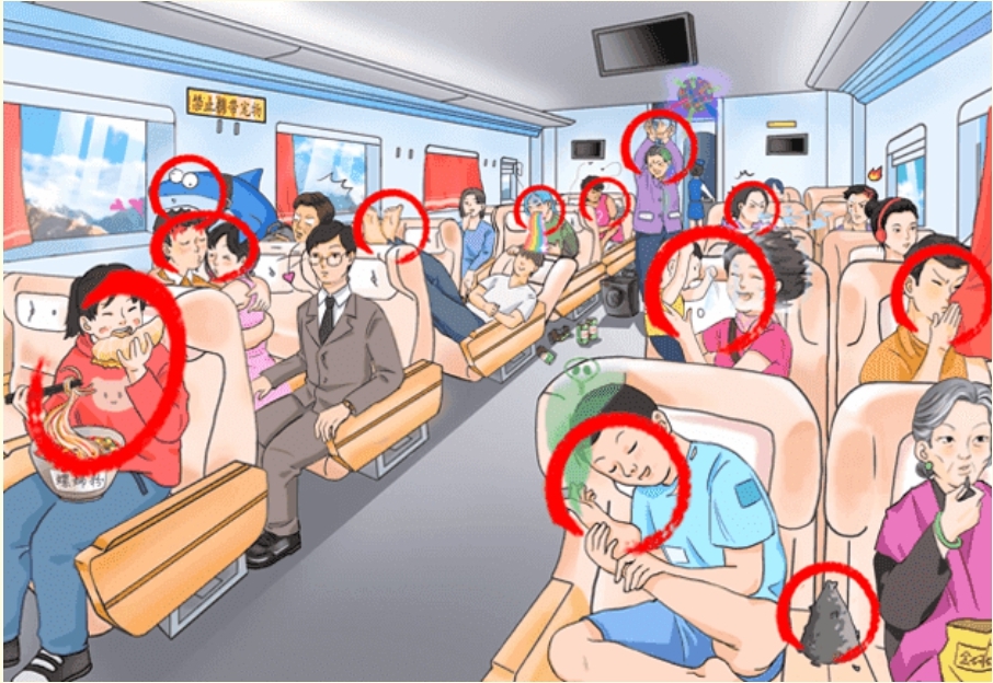 2。后面第三排的人脱鞋伸脚,第四排的人还在呕吐。