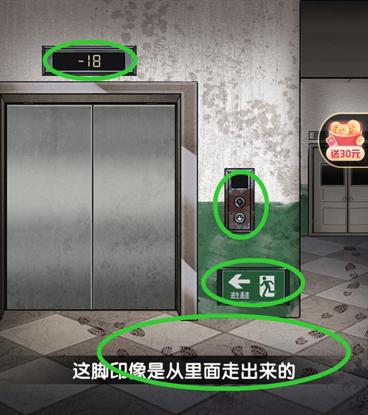 1。可以看到电梯楼层在-18层,按钮上有红色的血迹。