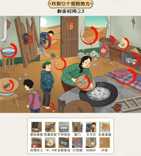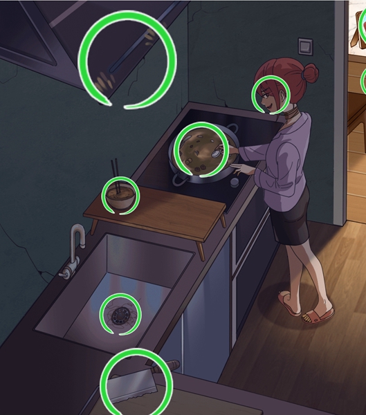1。点击查看厨房水槽被头发堵住的出水口,旁边是破旧的菜刀。
