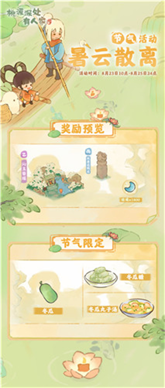 活动期间,山区居民可以种植特色农作物“冬瓜”,制作特色节气菜肴“冬瓜糖”、“冬瓜球汤”。他们可以通过提交节气订单来获得额外的月浪。落落山为此准备了太阳能限制建筑。山民们记得参加活动领取月狼,不要错过兑换时间哦!