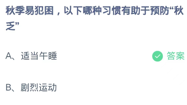分析:预防秋乏,首先要保证充足的睡眠,争取晚上10点前入睡,每天的睡眠要增加1小时。酷暑过后最好每天中午睡一个小时。年轻人午睡可以有效对抗秋乏,老年人午睡可以帮助降低心脑血管疾病的发病率。