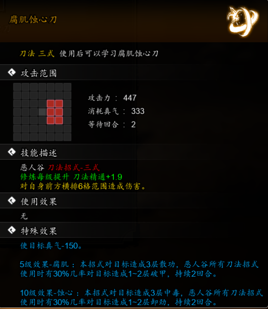 攻击力447,消耗真气333,等待转2。