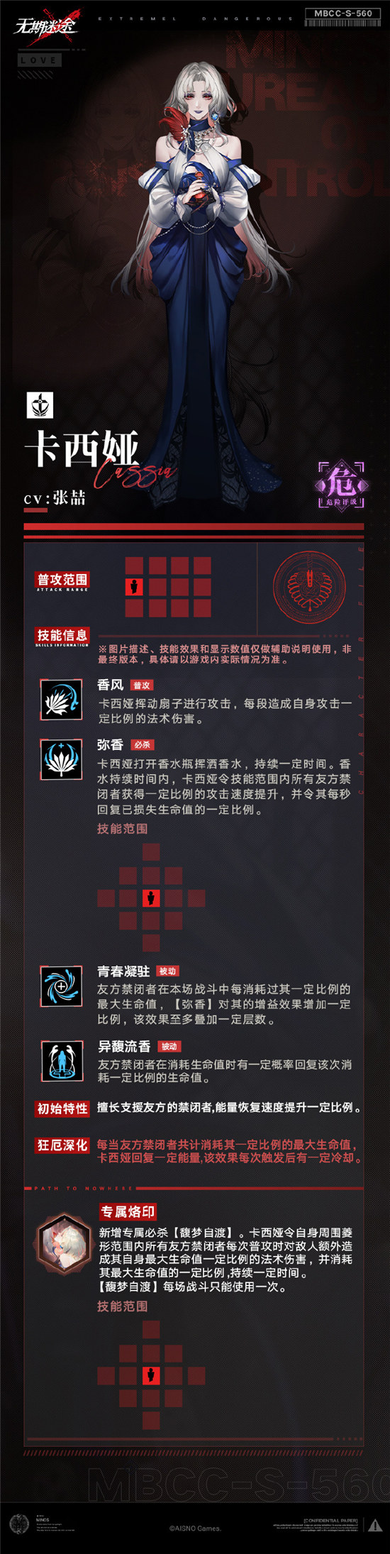 新增专属必杀【夫梦紫毒】。卡西亚使自身周围菱形范围内的所有友方禁锢,每次攻击时对敌人造成相当于自身最大生命值一定比例的额外法术伤害,并在一定时间内消耗自身最大生命值一定比例的法术伤害。时间。