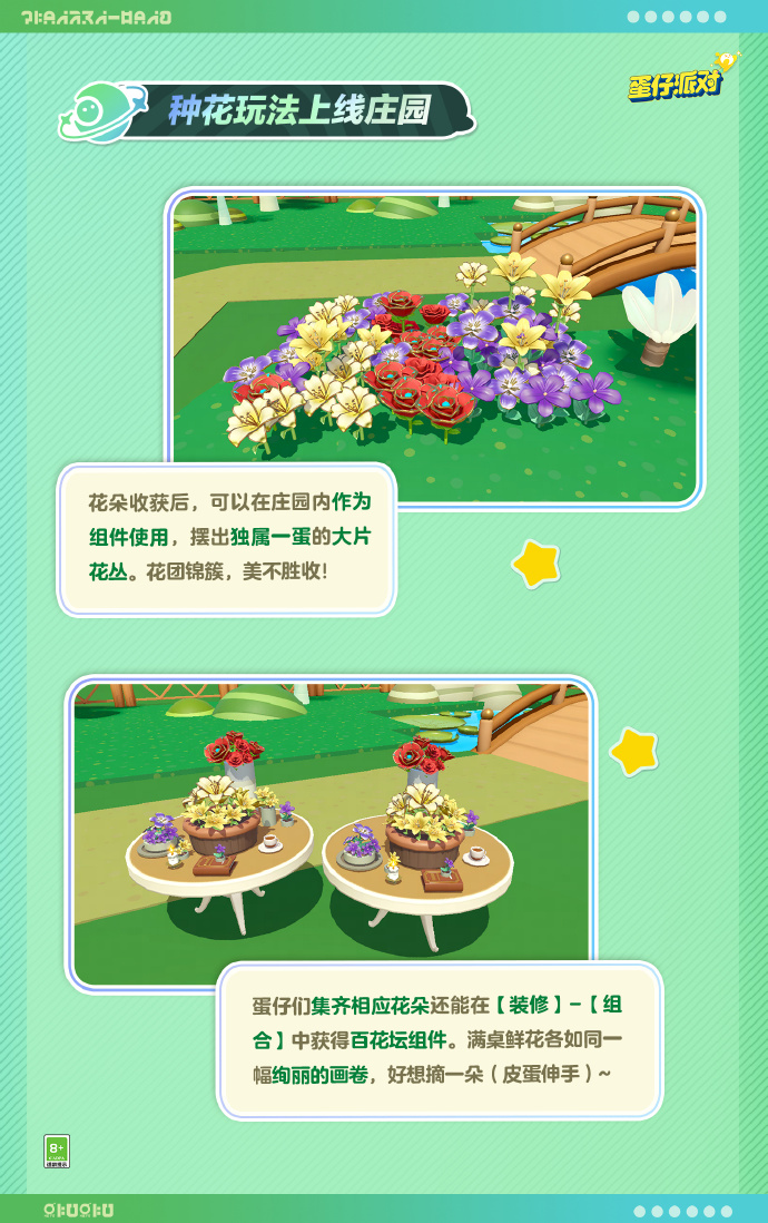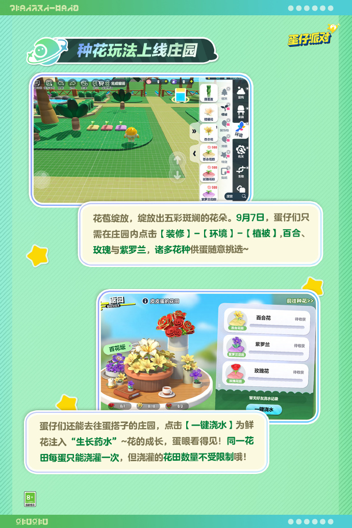 蛋仔们还可以去丹达子的庄园给花朵注射“生长药水”。每个鸡蛋只能给同一个花田浇水一次,但浇水的花田数量不限!