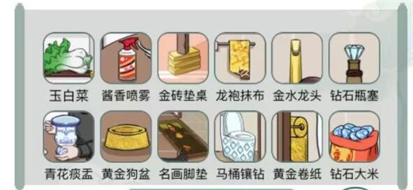 通关答案:翡翠白菜、酱香喷雾、金砖垫台、龙袍抹布、黄金水龙头、钻石瓶塞、青花痰盂、金狗盆、名画脚垫、镶钻马桶、黄金卷纸、钻石饭