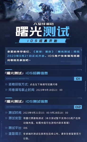 星球重启内测资格,开始播出。获得内测资格的玩家可以在游戏中提前体验游戏内容。这个内部测试是一个黎明测试。如果你想知道如何获得内测资格,让边肖带你去了解。