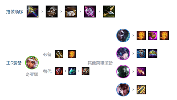 装备优先Chiana的装备,无尽正义缺一不可。剩下的一个最适合红手,其他暗夜或者泰坦也可以。艾克以法强装备为副C,猪女以肉为主T.