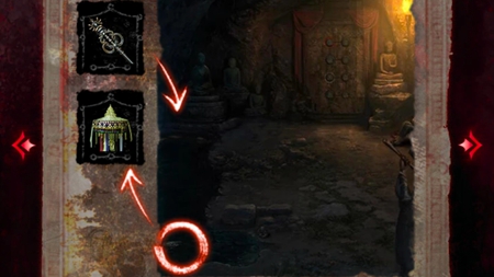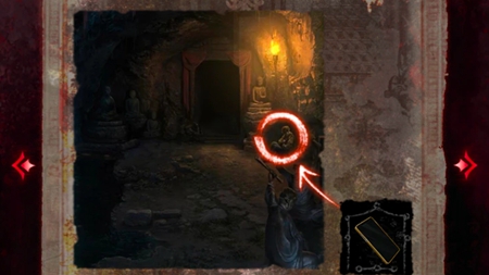 7。来到洞穴后,点击右下角的石像,点击石像直到所有的经书都被点亮,然后拿走禅杖。