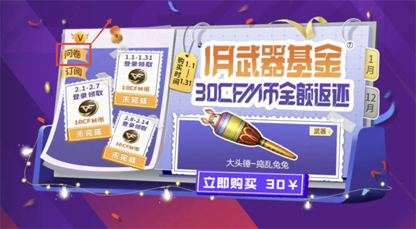 1。想要获得大头锤给兔宝宝捣乱的玩家,只需在1月份购买武器基金即可免费获得,费用为30元。