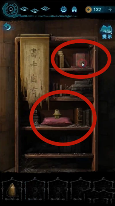 11.进入密室后,环视书架,将神庙金雕放在上面,看书获取信息。