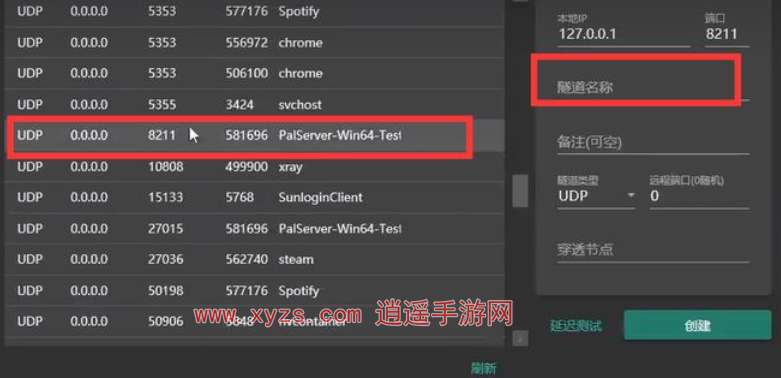 6、点击隧道上的加号,找到8211 PalServer-Win64-Tes1的服务器,在右侧设置隧道名称,点击延迟检测,选择节点即可完成创建。
