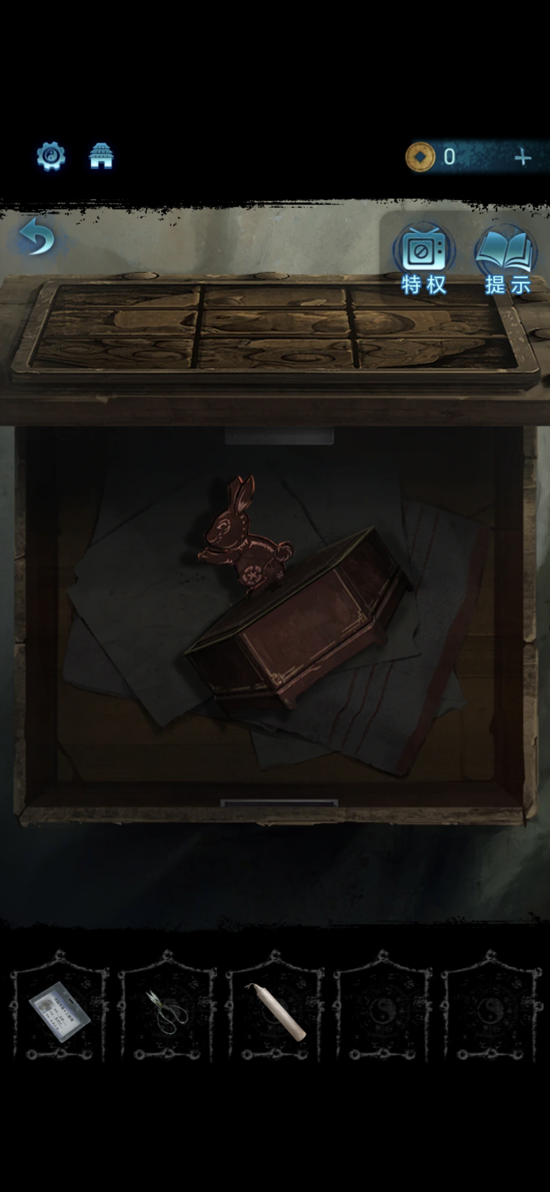 进入房间,掀开床上的布,点击盒子,玩拼图游戏,打开盒子,得到兔子音乐盒