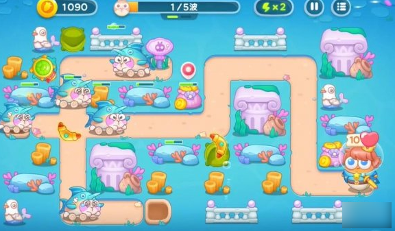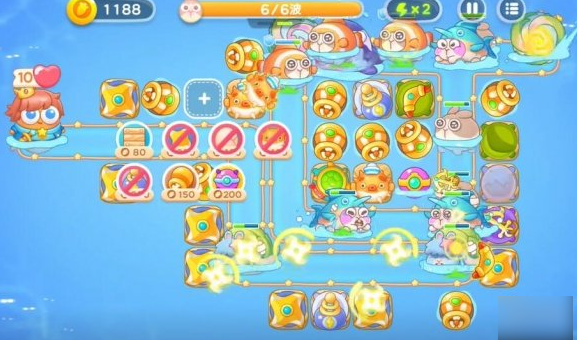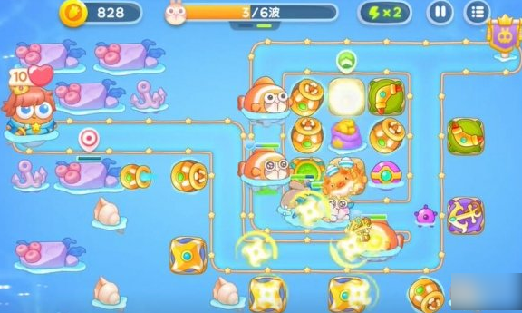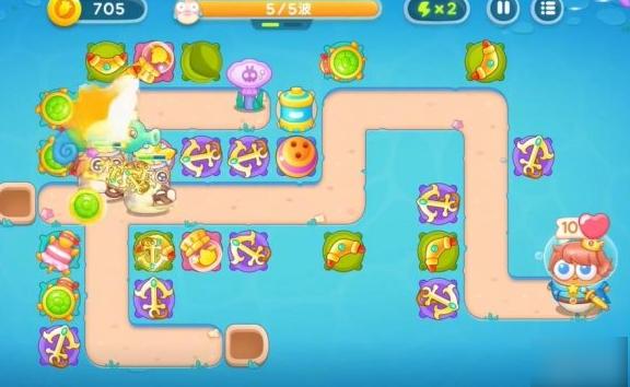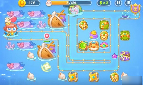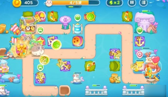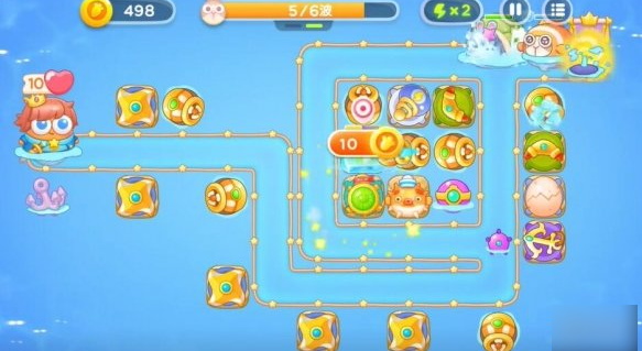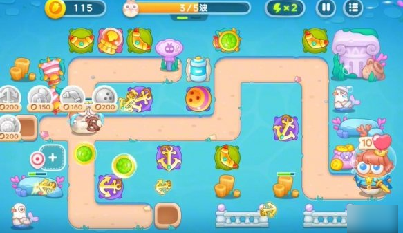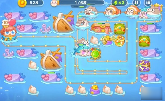 1.使用第一轮留下的回旋镖和锚清除路上的障碍物。放置鱼雷塔攻击水下敌人。第一回合与塔配合,抵挡第一波攻击。
